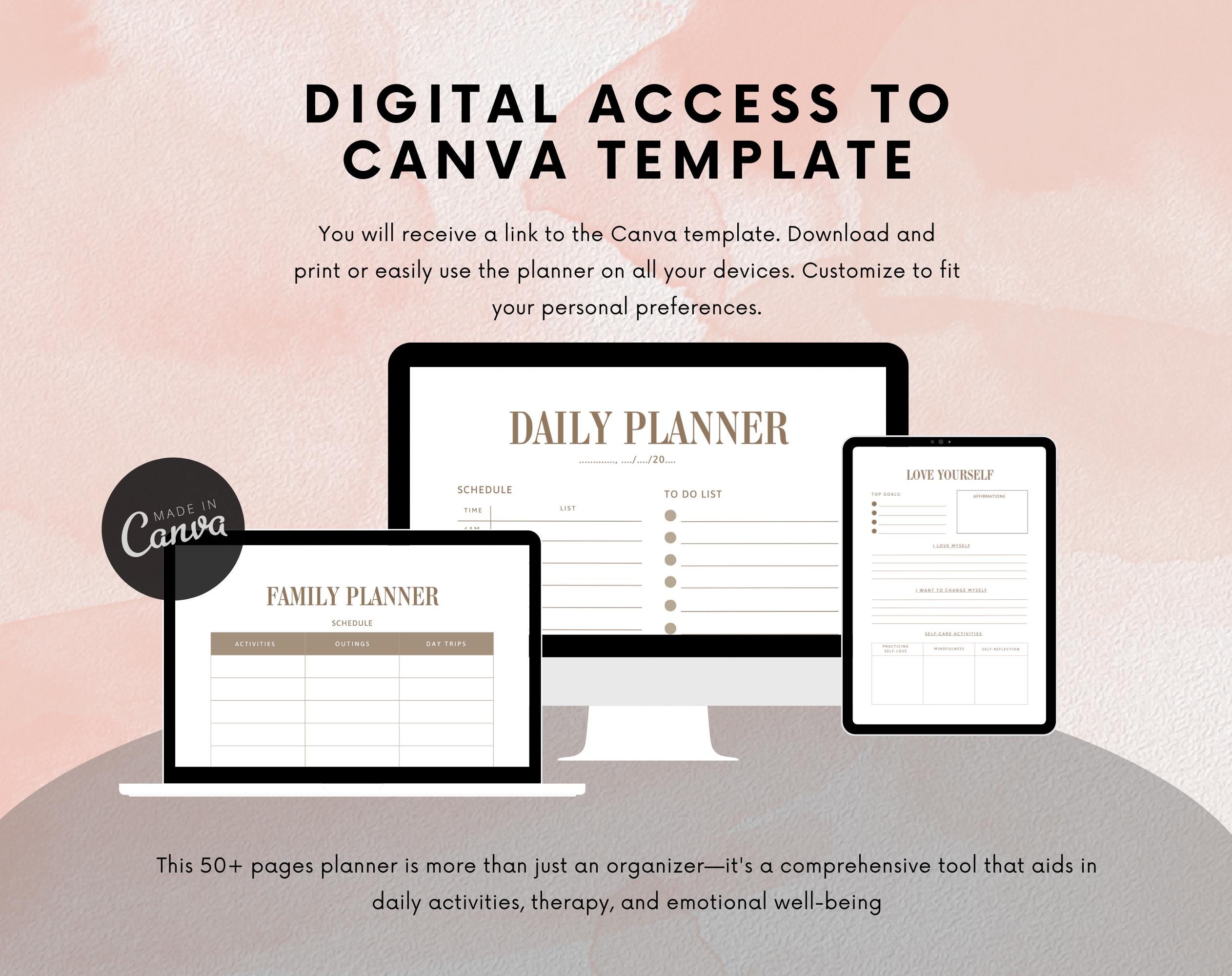 ✔️Open the PDF and click on the link to the Canva template. This link will redirect you to the Canva template and enables you to, use and customize your ADHD Planner for Adults.